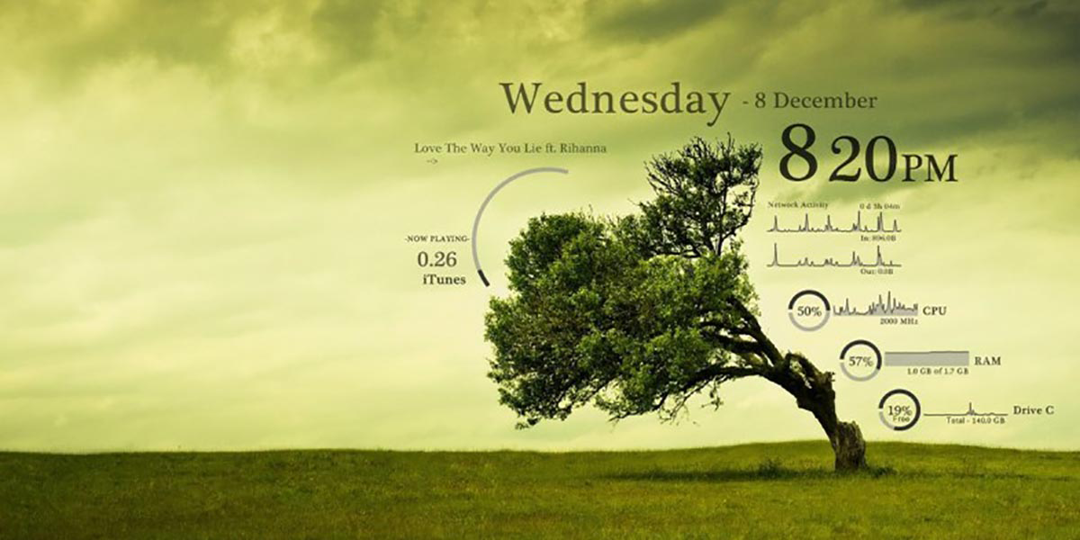 那么,Rainmeter是什么呢?Rainmeter是一款免费的、开源的、面向 Windows 个人电脑的应用程序,中文名叫雨滴。通过它你可以在你的桌面上显示包含内存,电池,RSS,天气等信息的可定制皮肤,许多皮肤还具有一定的功能:它们能帮你记录下你即将要做的事,把你的微博发布出去,控制媒体播放器等。它还能美化你的桌面,你可以完全按照自己的意愿去定制一款你想要皮肤,让你的桌面与众不同。废话不多说,先上几张Rainmeter搭建起来的桌面给大家看看效果。